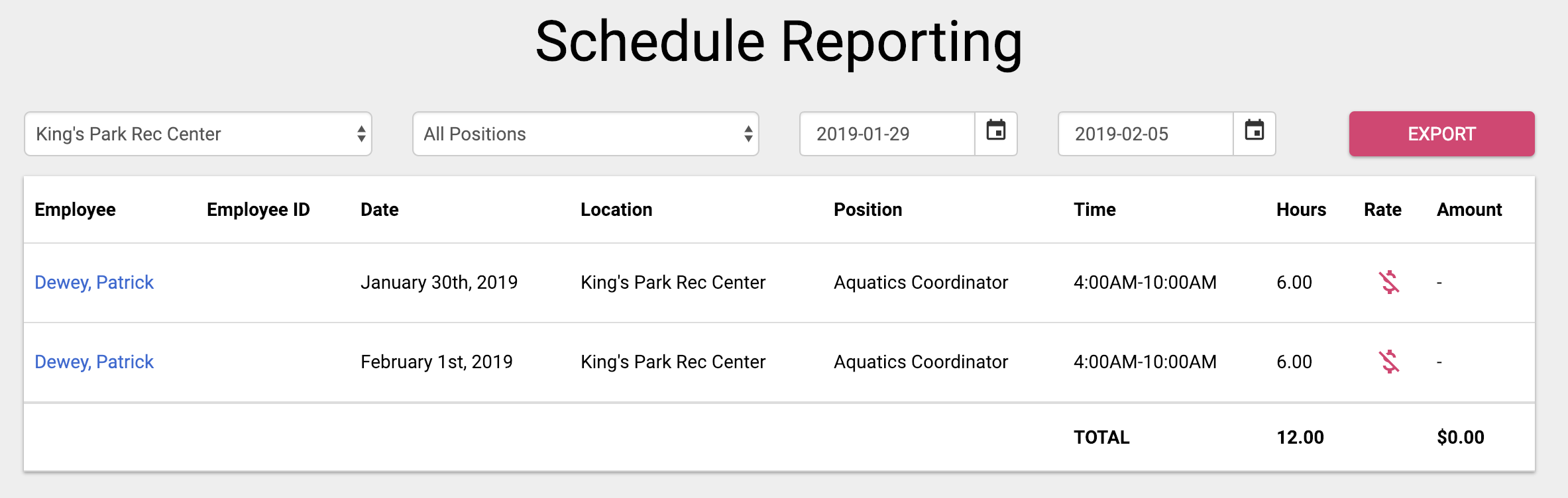 5. Added total hours (depending on the location, position, and date filters) to Schedule Reporting page so you can tally up how many hours your Lifeguards worked at King's Park Rec Center for example.